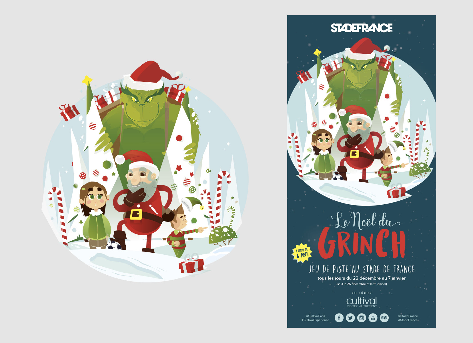 Illustrations pour la chasse au trésor au Stade France (2018 et 2019) avec le Grinch